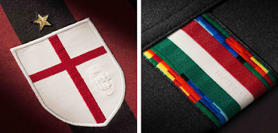 Les manches apportent également les pistes tandis que le côté, le bar et les épaules sont noirs, ainsi que d'un col rond. Le fournisseur aux trois bandes apparaissent en argent, de la même couleur, le nom du club "Le Milan AC," qui est vu à l'arrière du col.
